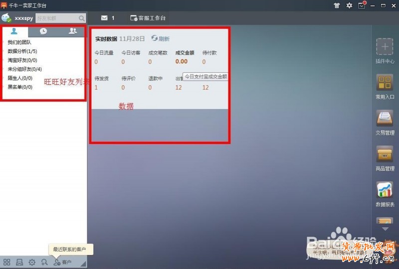 進(jìn)入千牛-賣(mài)家工作臺(tái)以后,我們首先看到的是自己的旺旺好友列表和實(shí)時(shí)數(shù)據(jù)。如果你之前登陸了旺旺,那么你的旺旺會(huì)被迫下線,不要以為自己的旺旺被盜號(hào)了,這就是工作臺(tái)和旺旺是一樣的。實(shí)時(shí)數(shù)據(jù)顯示的是今日的流量、方可、成交金額等,是我們對(duì)店鋪一目了然。