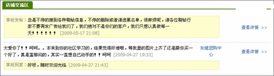 交流互動是網絡的最大優勢,淘寶給每個店家一個獨立的“店鋪的交流區”,功能非常強大,就像自己的一個小論壇,您在這里就是"版主"了,不用在擔心別人刪除你帖子,而且誰想留言發帖、是否被審批后顯示、能不能成為精華……生殺大權全在你噢,有很多朋友可能還不是很清楚,下面我告訴您如何好好利用店鋪交流區。