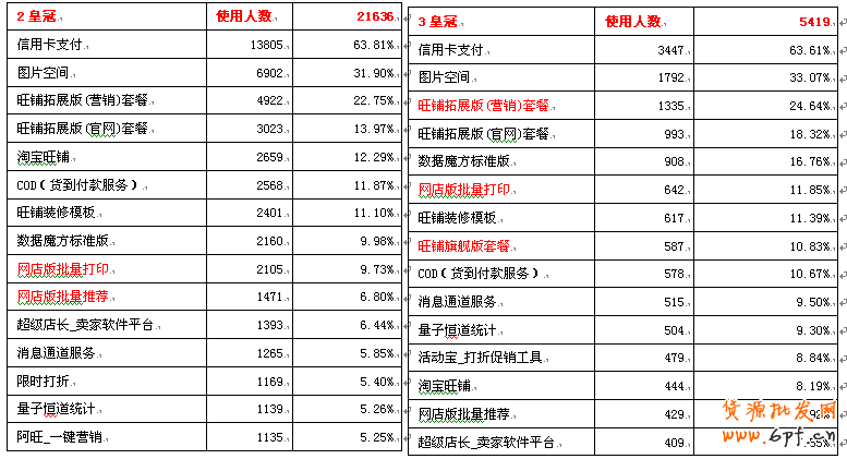 從各星級賣家訂購占比的數據中,我們可以看出各星級的訂購賣家服務工具的賣家在該星級的總賣家數中的占比情況。規律是,星級越高,訂購服務工具的賣家占比越大。皇冠以上的訂購服務工具的賣家占比基本都在80%以上。由此可以看出,越高星級的賣家對服務工具的需求越大;隨著店鋪規模的加增,賣家依靠人力來對店鋪進行管理,營銷越來越不可能,這個時候必須要借助一些賣家服務工具。