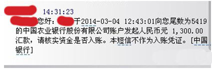 其實,到了這一步,掌柜已經掉入了騙子的圈套。不到一會兒,掌柜就會收到一條入賬的短信。內容大概如下: