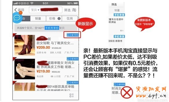 看到很多賣家應對式的全店設成了手機專享價,定價只比PC端低0.1或0.5元。如果您這樣子做就犯了大錯了,專享是一種讓客人心理形成個專屬的優惠落差才有吸引力,0.5元以下差價下流量費用都不夠,是不是有一種被玩弄的感覺?為形成這個價格落差你甚至可以提高PC端的價格,讓其與手機專享形成最少10元的差價。