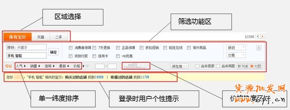 自淘寶網有了按類目、按屬性發布的商品后,就有了商品索引基礎,算法引擎就可以根據商品關鍵詞,為買家提供精確的搜索結果。那么,淘寶搜索的頁面結構是怎樣的呢?小編馬上跟大家一起來了解一下: