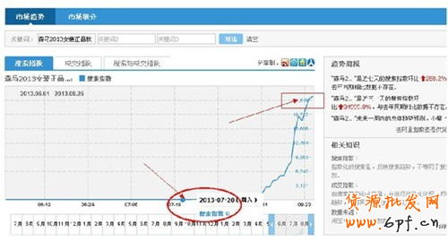 找到精品女裝類目 ,我們先來看搜索上升和搜索熱門 ,這里的核心是找到神詞的發(fā)源地。我們以第二個詞“森馬2013女裝正品秋”為例,看看數(shù)據(jù)魔方跟淘寶指數(shù)的數(shù)據(jù):