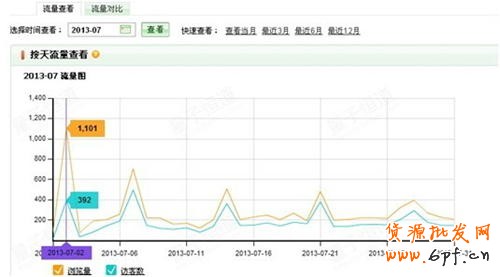 我是在6月27號發(fā)現(xiàn)了這個詞 ,但是這個詞在24號以前是沒有搜索的 ,所以我上加一個波點(diǎn)裙子,匹配這個關(guān)鍵詞。然后大概第二天這個詞有流量了,我看著實時訪問是從類目里過來,然后就開動類目精準(zhǔn)攔截。這是7月流量走勢圖: