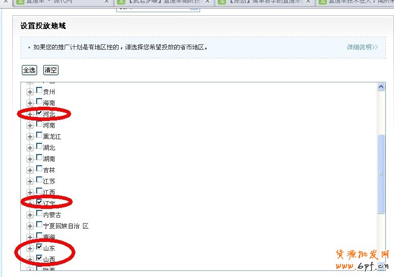 然后登陸直通車,找到產品所屬的推廣計劃,點擊設置地域,設置成只投放挑選出這幾個地域(記得還要把自己所在的省份