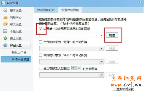 5、在自動回復的設置里,選擇想要設置的選項,點擊新增即可;