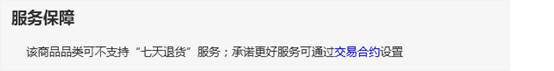 不支持"七天退貨"的商品,默認出現以下提示,如新鮮蔬果、定制商品、期刊圖書等;如要支持退貨服務,請通過交易合約設定