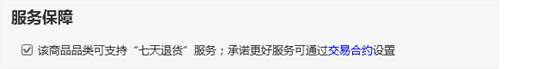 必須支持"七天退貨"服務的商品,默認出現以下提示且不能修改(如服裝服飾、數碼產品及配件、家紡居家日用、化妝品、嬰童用品等)