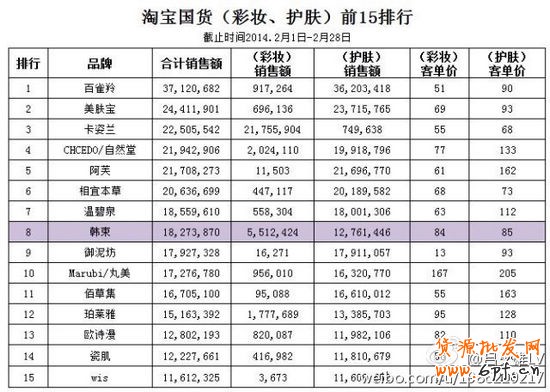2月淘寶美妝排名曝光 百雀羚國貨排行第一