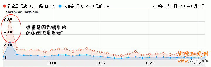 80后的小賣家,開店還不足三個月。最初開店的時候,和所有新人賣家一樣茫然不知所措,朵朵憑借自己的努力,漸漸的小店開始有了起色,訂單漸漸越來越多。現在朵朵把摸索出的一套自己的打理店鋪的小小經驗寫出來,希望能夠稍微幫助到新手賣家起步,因為朵朵知道剛剛起步的時候實在是太難太難了。尤其朵朵身體不好,身患IGA三級,現在每天還靠吃激素進行治療,旺旺只能經常掛機,所以很多咨詢過來的親都無法回復,這絕對絕對不是有意怠慢,還請各位親體諒朵朵。下面還是進入正題,首先小秀一下11月份也就是開店第二個月的流量,這都是朵朵努力的結果。(11月2日那天流量暴增至6000多是因為精華帖的緣故)