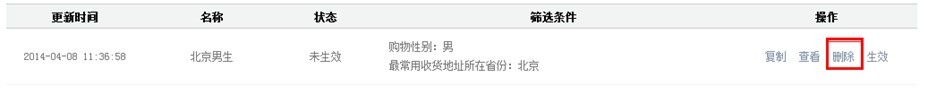 如果生效的人群沒有被模版使用,那么點擊人群列表右側的刪除按鈕,可使其恢復到未生效狀態,再點擊一次刪除后,可將該人群從人群列表中刪除