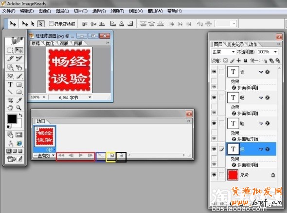然后,用鼠標點擊上面紅色方框處,此時,PS會自動將當前工作界面轉換到ImageReady當中,如下圖所示: