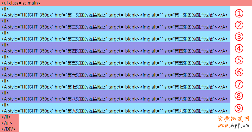 這時大家可能會問了,如果不需要那么多展示圖或者需要更多的展示圖,我們該怎么做呢?呵呵,很簡單,仔細觀察,其實藍色和紫色塊代碼都是一樣的,也就是說,想要減少展示圖片,只需要刪除其中一個藍色或者紫色塊所對應的代碼,反之,如果想增加展示圖,我們就可以增加藍色或者紫色塊所對應的代碼,增加的越多,所展示的圖片就越多,為了讓大家更直觀了解,我放兩張顯示圖