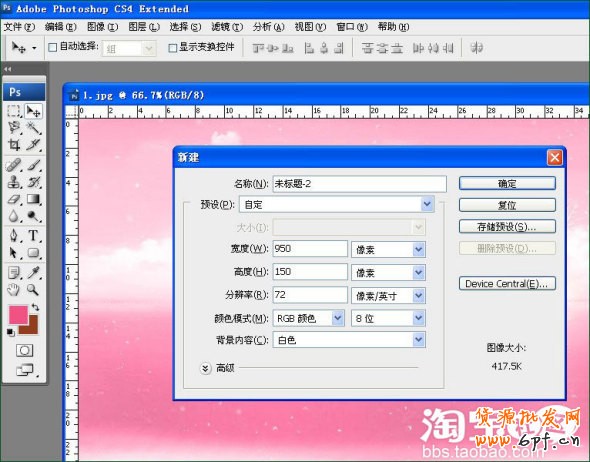 2. 【文件】——【新建】建立一個寬度為950像素,高度為150像素,顏色模式:RGB,背景內容白色,分辨率為72像素/英寸的新圖片。