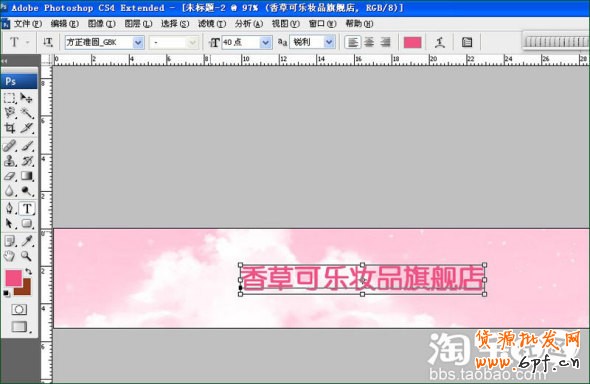 4. 接下來是文字制作,在【工具欄】點擊【橫排文字工具】,字體選擇【方正準圓】,字體40點,輸入“香草可樂妝品旗艦店”,移動文字到恰當合理位置。