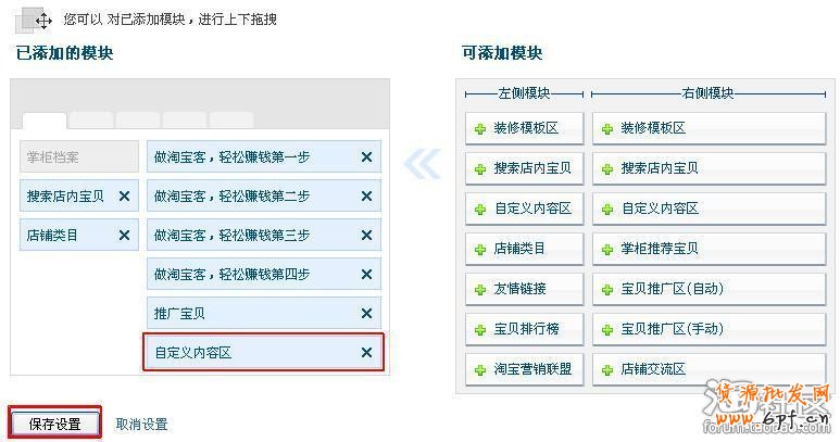 6、由于希望促銷區(qū)能在頁面上半部分顯示,用鼠標將上圖紅框區(qū)的自定義內(nèi)容區(qū)拖到最上面,然后點擊“保存設置”按鈕,保存頁面設置,保存后如下圖所示。