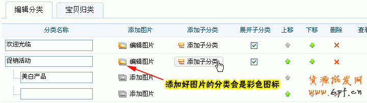 3、進(jìn)入寶貝分類管理界面,操作如下圖,非常簡單明了;
