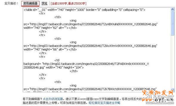 7、轉到寶貝描述“編輯HTML源碼”編輯對話框下,將上一步所拷貝的內容粘貼到對話框的編輯區(qū)中。然后點擊“使用編輯器”按鈕。