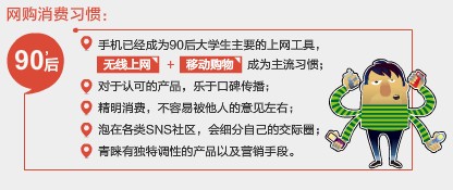 據統計,86%的90后大學生用手機上網,其次才是筆記本和臺式電腦,分別是79%和40%,而中國網民使用移動互聯網的比例僅為66%。無線上網和移動購物成為90后的網購消費主流習慣。因此,要吸引更多的90后,無線端店鋪的運營是賣家們不得不重視的內容。