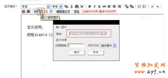 在編輯寶貝頁面,在寶貝詳情處,點擊"插入/修改圖片"按鈕,然后再彈出的窗口中輸入您獲取的統計代碼,然后點擊"確定"保存所做的操作. 再然后保存您對寶貝做進行的操作.