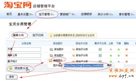 獲取了統計代碼后,請您登錄到店鋪管理平臺,在“寶貝管理->寶貝分類管理”下面新建一個分類, 并為它添加圖片,在圖片的鏈接中粘貼入您在量子網站獲取的統計代碼,然后保存您的操作即可.具體操作界面如下圖: