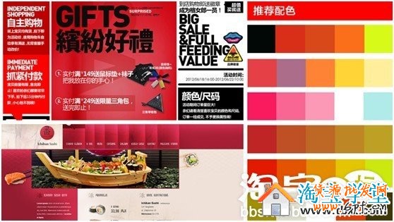 正如前文所說,紅色是淘寶店鋪做活動時出現頻率最高的顏色,但是使用過度的話也容易造成視覺疲勞。為了讓紅色更好地發揮效果而又不至于過度,賣家在使用時可以把紅色和金黃色、橙色、白色、黑色等相搭配。