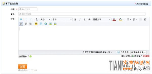 4、在彈出的新建模塊網頁中填寫標題、備注、詳情內容,然后點擊新增,即可完成模塊的創建: