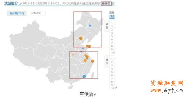 所以投直通車的時候,我們一定要做好數據分析,不然你有錢排在上面都沒人去點,我們一定要根據自己所在的類目去做好數據分析,去尋找我們的目標客戶群體到底在哪些地方。再給大家舉個例子,“座便器”和“馬桶”是同樣的東西是吧,但是南北語言的差異,不同的地方叫法也是不一樣的。所以在投直通車的時候,我們根據自己產品的叫法特點,也需要做去做地域分析,不同的地域關鍵詞的投放策略也是不一樣的。如圖: