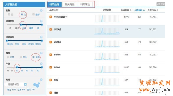 我們可以根據自己的定位調整人群篩選器,調整好人群是非常關鍵的。例如我們到底定位的是高端丶中端還是低端,定位的人群是全部還是只針對女性或男性,然后通過人群篩選器來篩選出哪些相關品牌丶相關產品丶相關店鋪是我們最直接的競爭對手。如圖,我們定位的是女性客戶,消費層級是中級,年齡在30歲以上的人群,則看右邊的變化,則會出現相關的品牌和商品,然后找出我們最直接的競爭對手,再來制定相應的營銷計劃。