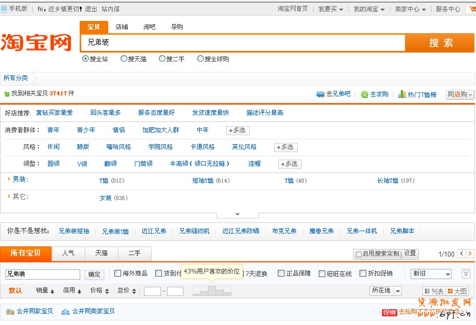某A打算買一件兄弟裝,假設(shè)他首先想到的是上淘寶。那么當(dāng)他進(jìn)入淘寶網(wǎng)首頁后,自然而然的在淘寶首頁搜索框輸入:兄弟裝 并按下回車,或者他還沒來得及按下回車,系統(tǒng)就已經(jīng)有兄弟裝的關(guān)鍵詞緩存出現(xiàn),就在這一秒不到的時(shí)間里,出現(xiàn)了下面的截圖,也就是首先給顧客看到的前臺(tái)上展示的標(biāo)簽。要說的重點(diǎn)就在這個(gè)截圖。下面一一來分析