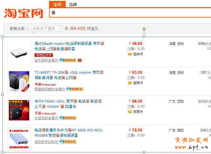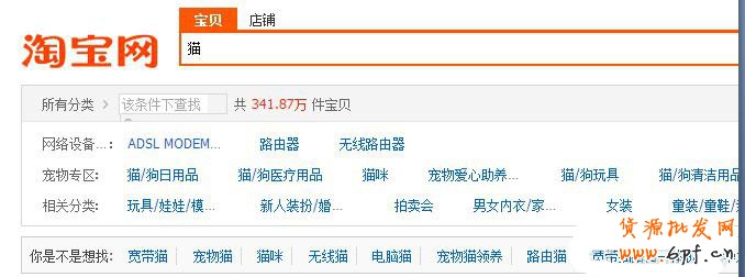 比如,用戶在輸入“貓”的時候,搜索引擎會“猜”你想要的是上網用的那種電子設備,而不是我們家里養的寵物貓咪,那么它提取并且推薦給你的也都是上網用的調制解調器,搜出來的店鋪也都是數碼類的店鋪,如圖: