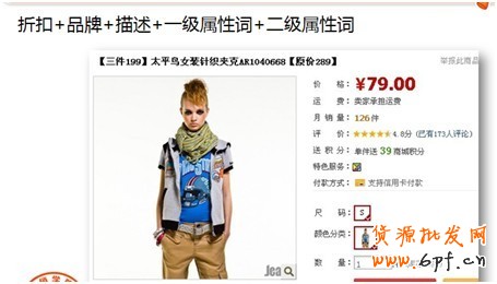 “韓版”風(fēng)格,這個(gè)產(chǎn)品的風(fēng)格屬性也定下了。“休閑小西裝領(lǐng)短外套”,這組詞匯我之所以放在一起,既可以拆分成“休閑小西裝”“短外套”也可以拆分成“休閑 西裝”“短外套”也就是說,這個(gè)短語也覆蓋了很多的搜索信息。最后一組數(shù)字“W33030”是這個(gè)商品的貨號(hào)。其中覆蓋了現(xiàn)在的季節(jié)當(dāng)中以下熱搜詞匯“購物新風(fēng)尚”“韓版”“女裝”“2013”“西裝”“外套”等等熱搜詞匯。在這里,其實(shí)除了熱搜之外,商品的基本屬性表達(dá)的也很明確。這是大牌的做法,小賣家可以借鑒,但考慮到小賣家資金實(shí)力不夠,所以在設(shè)置商品屬性詞時(shí),可以從小處著手,不像他們那么覆蓋廣,力求覆蓋精。
