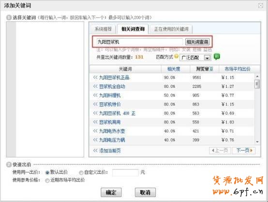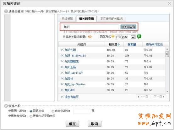 添加關鍵詞的時候,通過使用“系統推薦詞”或者“相關詞查詢”,可以按照相關度或搜索量排序進行關鍵詞的選擇。