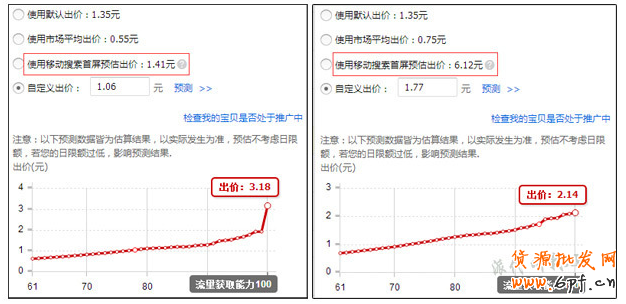 從上邊左圖可以看出PC端要出到3元左右才能在第一頁,而移動端只需要1.41元就可以出現(xiàn)在首屏,說明無線端的權(quán)重比PC端還要高,如果PC端質(zhì)量得分是8分,那無線端估計是9分,10分了;右邊那個就相反了,PC端第一名只要2.14元,移動端展現(xiàn)在首屏需要6.12元,如果PC端是8分,估計移動端只有6分左右。