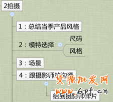 很多朋友可能在拍攝圖片上出現問題,都是因為沒有和攝影師溝通好,直接把產品丟到拍攝機構,最后噼里啪啦拍好了,出來一看,20件衣服都用一條短褲搭配!沒有做搭配,沒有做策劃,這些機構不是一個你所合適的機構,因為他們拍出來的東西沒有競爭力,沒辦法把你的產品拍好。下面總結一下拍攝流程: