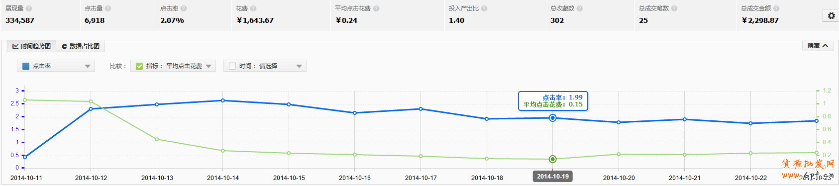 這是10.11重新推廣的數據,前兩天數據還是比較差的,但是第三天的時候,我們重點優化了一款數據較好的寶貝,然后圍繞這款寶貝不斷作優化,因為沒有店鋪基礎,所以成交還不是特別理想,且臨近雙十一,買家更偏向收藏和加入購物車。但是,13天收藏和購物車加起來有700多個,對于一家新店鋪來說還是有一定突破的。而且,數據可以看出,有繼續向好的趨勢,成交趨勢也是如此。