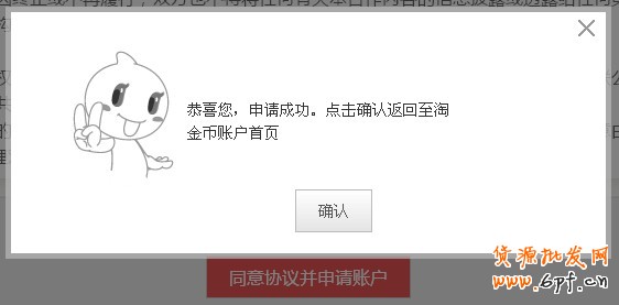 3、查看淘金幣賬戶協(xié)議,點(diǎn)擊【同意協(xié)議并申請賬戶】,提示申請成功,點(diǎn)擊【確認(rèn)】