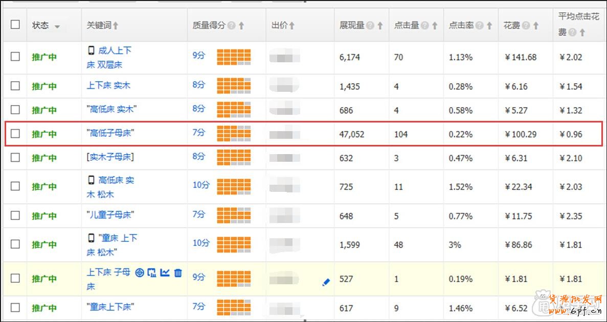 1、一般直通車推廣的詞分為廣泛詞、精準詞以及中心詞,而我們盡量添加的是精準詞,最好是可以充分描述產品特性以及材質等的內容為佳。比如賣兒童子母床的賬戶,其產品特性就是:“子母床”、“上下鋪”、“兒童”、“松木”等這些詞中有一部分或者全部都是能夠方便消費者精確定位到你的商品,而帶有“床”、“單人床”這類的熱詞大詞,相對于比較廣泛,競爭很激烈,雖普遍展現量大,但是點擊量比較少,市場的出價會很高,所以,建議賣家可以添加精準詞,從而有效鎖定特定的目標消費人群,將廣告投放到更加精準的客戶群身上,能獲得更好的效果。從下圖也可看出,精準詞比廣泛次的ppc要相對低。