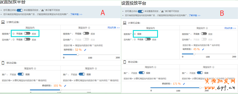 (2)如果您是小賣家,則可能無法關(guān)閉PC端搜索(如圖B),那樣的話,就相當于只開了站內(nèi)的搜索推廣,那么我們可以站內(nèi)搜索推廣開著,提高移動的投放比例。因為站內(nèi)的搜索競爭較大,你出詞價在1元,那么相應的,我們加大移動端折扣比列,就相當于能出到1.5元。PC端出價低,就引不了流量,但是無線端的流量一樣能來!這樣設(shè)定的話,移動折扣要在150%以上,效果還是不錯的。