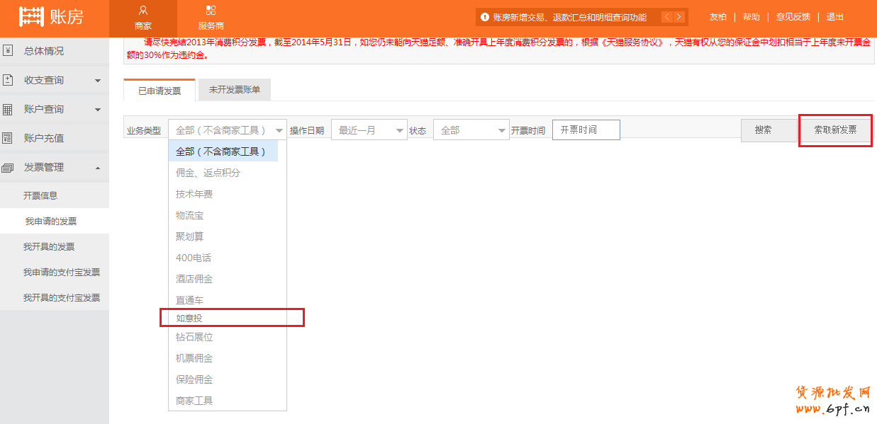 登陸淘寶“賬房”(http://pay.taobao.com/)->發票管理->我申請的發票。選擇業務類型為“如意投”,點擊“索取新發票”。