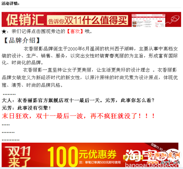 衣香麗影也經常跟隨淘寶的大潮流做一些資源推廣,包括聚劃算、品牌團和品牌特賣。自從促銷匯開通綠色通道以后衣香麗影也及時配合促銷匯做推廣。