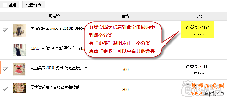 2、可對(duì)單個(gè)未分類的寶貝添加分類,也可進(jìn)行“批量分類”的操作,如圖: