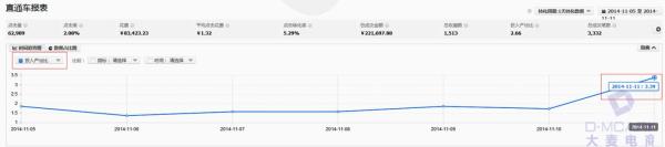 雙11終于到了,我們打開了全店的所有流量渠道,所有計劃改成了全國投放,分時折扣比平時增加了20%-40%的幅度。通過天貓直通車報表,我們發現在無線端和站外的投放上相對應的PPC較低,也就是說流量的成本都較低。我們幾乎把站外和移動端的折扣拉大到了200%,每個計劃都加滿“加絨、保暖、加厚”等這些寶貝的核心特性詞,設置單獨的雙11的促銷詞的計劃,專門推放雙11的促銷詞,而且每個計劃都使用雙11標簽的推廣圖,主推的計劃設置成無限日限額。