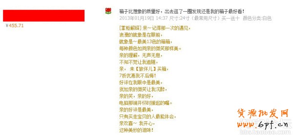- 另外我們在發出去的包裹里,都會放一封感謝信,感謝信的文案都是我們精心寫的,而且我們刻意買了很多好看顏色的打印紙來打印。顧客是上帝,人家肯光顧你店你是不是應該感謝他,讓他記住你?如果一個人好不容易通過淘寶千千萬萬的賣家信息搜索到你店鋪來了進行了一次購物,你沒有一點可以讓他記住你的店鋪的好的地方,而是拼命的去催他確認收貨給好評,這樣的購物,又何來的用戶體驗呢?記住,用戶體驗不單單只是店鋪裝修好,界面設計的漂亮,用戶體驗是從買家進到你店鋪到收到貨以后你所進行的服務整個一系列的!舉例說明,一個香港的買家來我店里買拉桿箱,拉桿箱是屬于大物件,發到香港還只能發順豐,我特意咨詢了順豐的客服,也在順豐的網站上查詢了得出運費補差是180元,然后我也把順豐官網的價格結果截圖給買家看了,買家說沒問題,付了180元運費給我,第二天我叫來順豐發件,順豐說可以發到香港的經濟快遞,慢兩天,但是可以便宜三分之一,我當然二話不說發便宜的,然后發好后馬上聯系香港的買家退六十元運費給她,她都感動死了。這個買家如何感動的,她都寫在評價里了,各位不信的去我店里的評價找這位香港買家的評價吧!