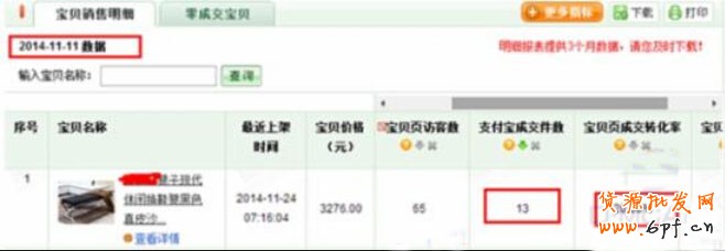 就在我們調(diào)整好該寶貝在店鋪的各個位置都能夠得到展現(xiàn)之后,雙十一也到了,從上圖中我們可以看到,在雙11當(dāng)天,該寶貝在降權(quán)的情況下,也能夠成交13件,對于這樣的效果我們覺得還是很不錯的了,畢竟開店的時間不長,而且寶貝還是在降權(quán)的情況下取得這樣的效果。