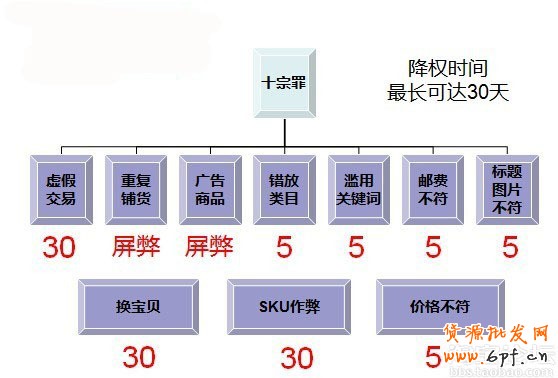 大家看到的紫色模塊里就是十項違規的名稱,下面的紅色的字體就是處罰情況(天數),那么,可以看到最嚴重的有兩項一項是重復鋪貨、一項是廣告商品