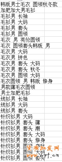 從上圖表中可看出,出現頻率比較高的詞有“針織衫難”、“大碼”、“套頭”、“毛衣男”等,所以,我們就可以用針織衫男 套頭等這些詞在淘詞里面去找衍生詞。