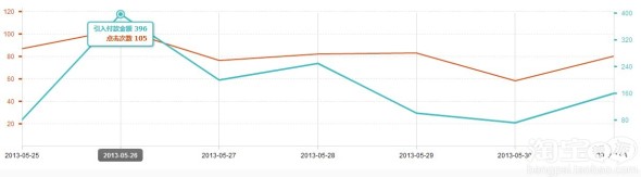 這邊可以看到最高的點一天點擊數是105,引入的付款金額是396元,那么平均的轉化率是6.06%
