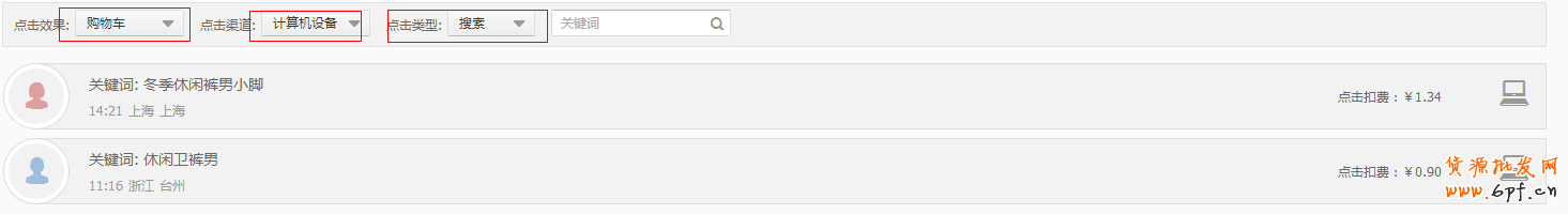 2、接著根據(jù)點擊效果、點擊渠道和點擊類型來篩選關(guān)鍵詞,或者搜索某個關(guān)鍵詞來看數(shù)據(jù)。