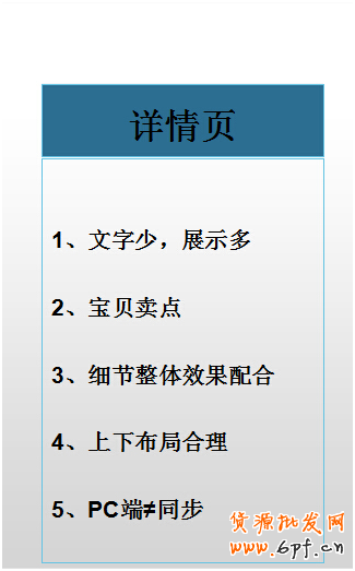 手機端訪客在瀏覽寶貝的詳情頁的時候,不會像PC端那樣會停留很長時間,手機加載很慢,就會導致挑失,所以,切記不要將PC端的詳情頁默認上傳到手機端詳情頁中,我們手機端的寶貝詳情頁一定要簡單明了,重點是突出寶貝的賣點就可以了。